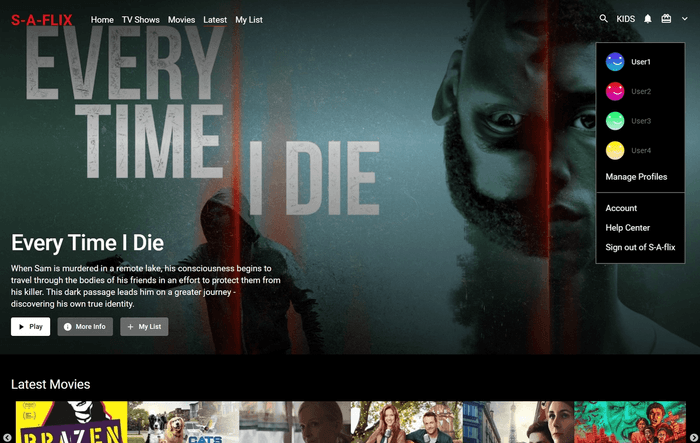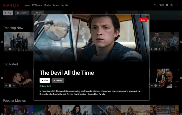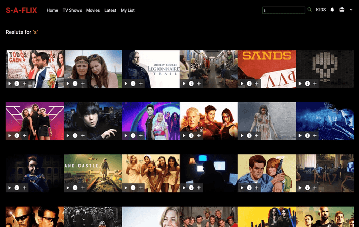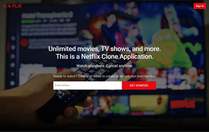 The layout, color and text of S-A-flix are almost the same as Netflix. I used Firebase and Redux-Saga to manage user authentication. I used "The Movie Database(TMDb)" to fetch Movies and TV Shows data.